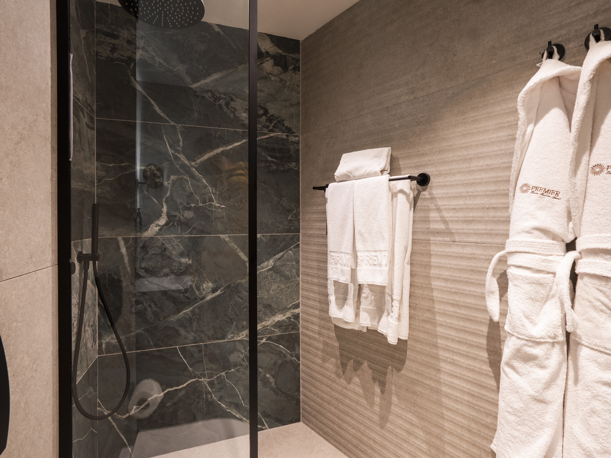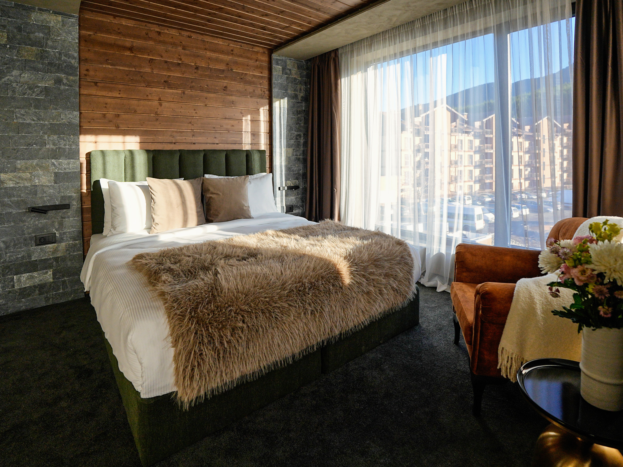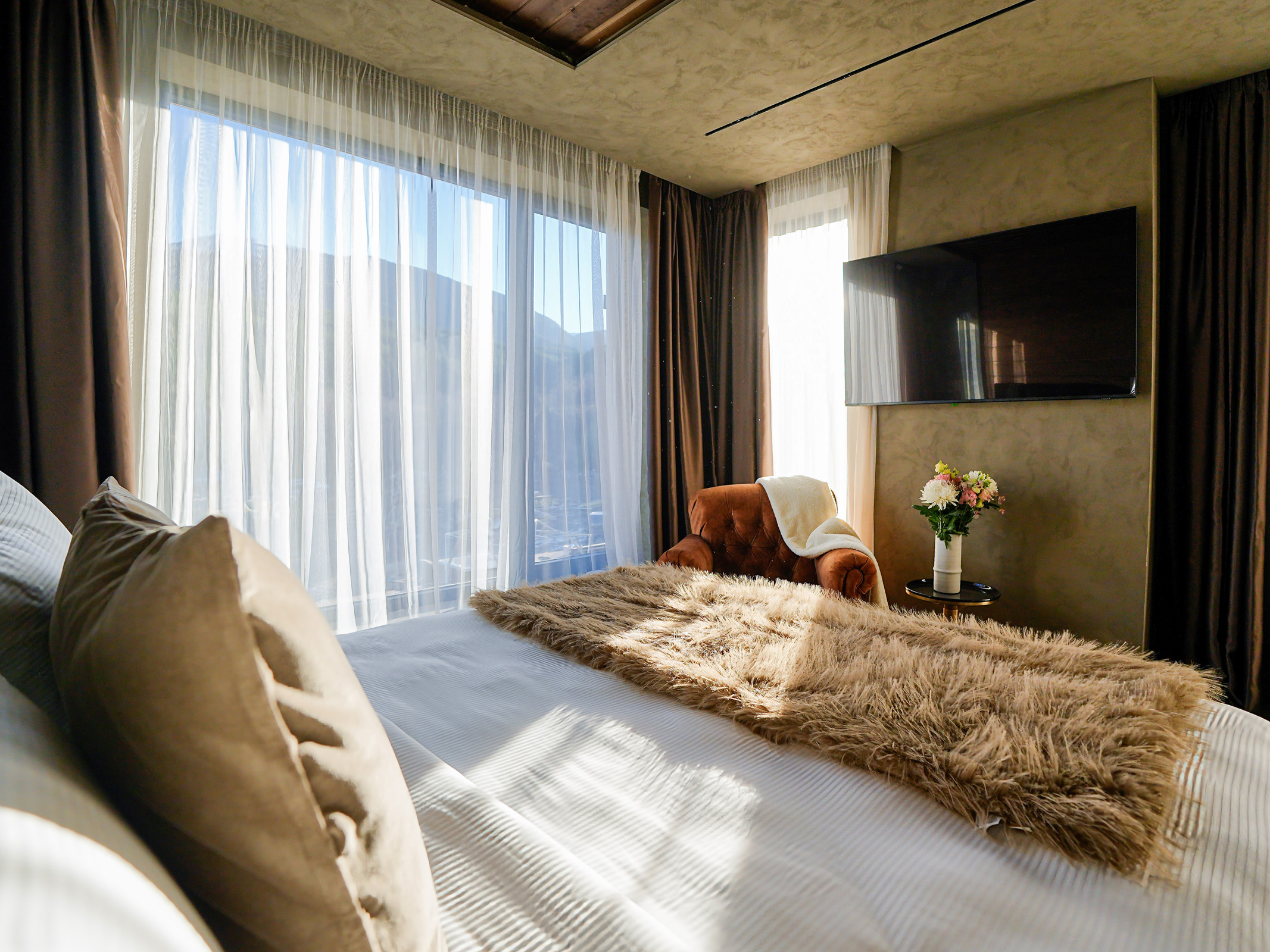Floor-to-ceiling windows frame breathtaking views of the Pirin Mountains, allowing natural light to flood the room and bringing the outdoors in. The room features a comfortable king-size bed, a stylish bathroom with a walk-in shower, and modern amenities that ensure a seamless and relaxing stay.